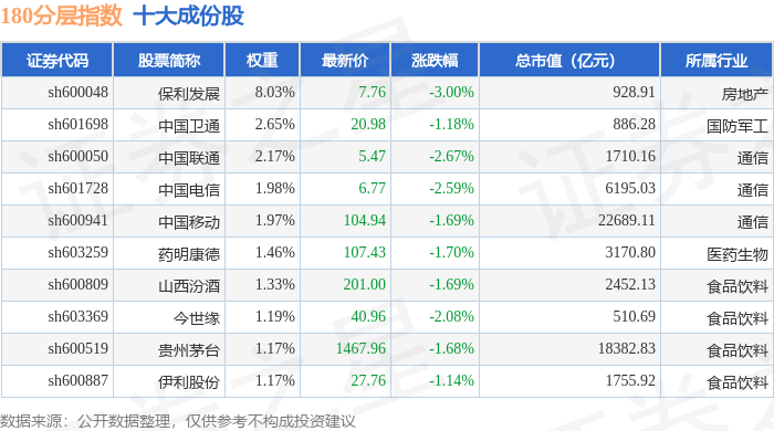 证券之星消息,9月18日,180分层(000093)指数报收于12042.37点,跌1.32%,成交4419.37亿元,换手率0.7%。当日该指数成份股中,上涨的有26家,中微公司以11.43%的涨幅领涨,下跌的有153家,江西铜业以6.41%的跌幅领跌。