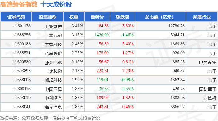 证券之星消息,9月18日,高端装备(000097)指数报收于11063.9点,涨0.66%,成交2806.18亿元,换手率2.35%。当日该指数成份股中,上涨的有24家,中微公司以11.43%的涨幅领涨,下跌的有35家,福莱特以5.88%的跌幅领跌。
