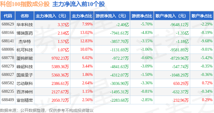 资金流向方面,科创100(000698)指数成份股当日主力资金净流出合计28.03亿元,游资资金净流入合计7.89亿元,散户资金净流入合计20.14亿元。成份股资金流向详情见下表: