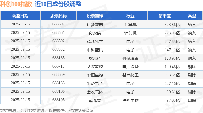 近10日内科创100(000698)指数成份股做了调整,新纳入了5只股票,剔除了5只股票。