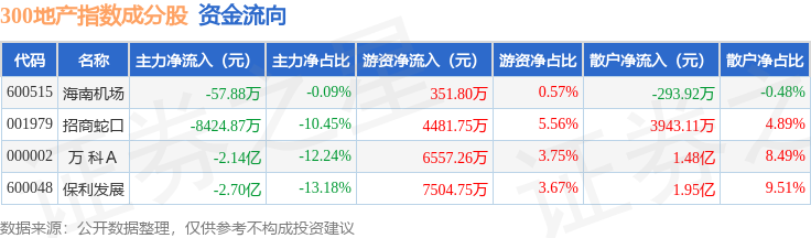 资金流向方面,300地产(000952)指数成份股当日主力资金净流出合计5.69亿元,游资资金净流入合计1.89亿元,散户资金净流入合计3.8亿元。成份股资金流向详情见下表: