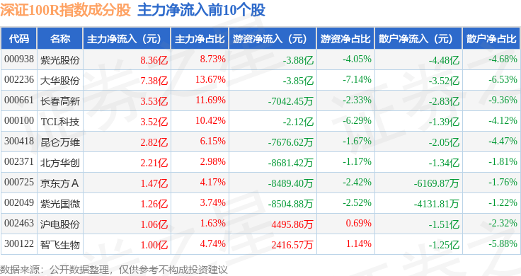 资金流向方面,深证100R(399004)指数成份股当日主力资金净流出合计166.93亿元,游资资金净流入合计37.74亿元,散户资金净流入合计129.19亿元。成份股资金流向详情见下表: