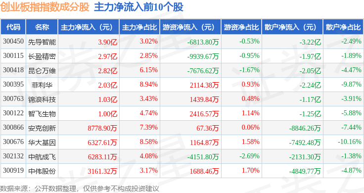 资金流向方面,创业板指(399006)指数成份股当日主力资金净流出合计189.11亿元,游资资金净流入合计65.39亿元,散户资金净流入合计123.72亿元。成份股资金流向详情见下表: