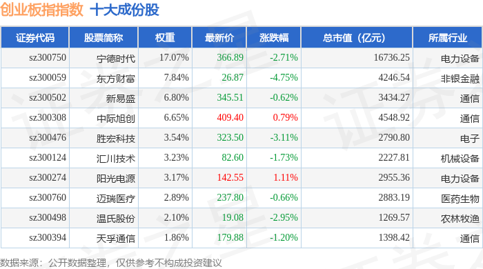 创业板指(399006)指数十大成份股详情如下: