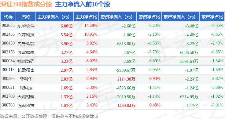 资金流向方面,深证200(399009)指数成份股当日主力资金净流出合计145.46亿元,游资资金净流入合计48.39亿元,散户资金净流入合计97.07亿元。成份股资金流向详情见下表: