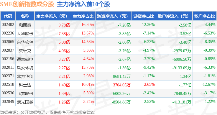 资金流向方面,SME创新(399017)指数成份股当日主力资金净流出合计32.58亿元,游资资金净流出合计14.67亿元,散户资金净流入合计47.25亿元。成份股资金流向详情见下表: