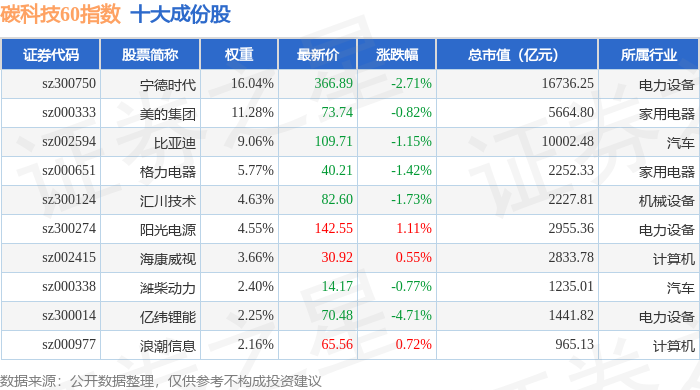 证券之星消息,9月18日,碳科技60(399060)指数报收于3255.65点,跌0.94%,成交2076.49亿元,换手率2.85%。当日该指数成份股中,上涨的有12家,三花智控以8.71%的涨幅领涨,下跌的有48家,晶澳科技以5.54%的跌幅领跌。