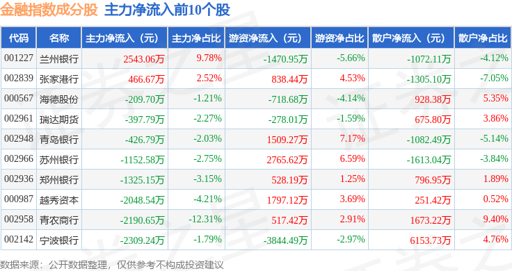 资金流向方面,金融指数(399240)成份股当日主力资金净流出合计120.4亿元,游资资金净流入合计41.05亿元,散户资金净流入合计79.34亿元。成份股资金流向详情见下表: