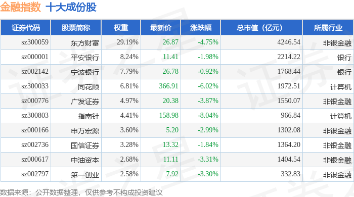 证券之星消息,9月18日,金融指数(399240)报收于1688.51点,跌3.82%,成交716.17亿元,换手率2.31%。当日该指数成份股中,下跌的有35家,指南针以8.04%的跌幅领跌。