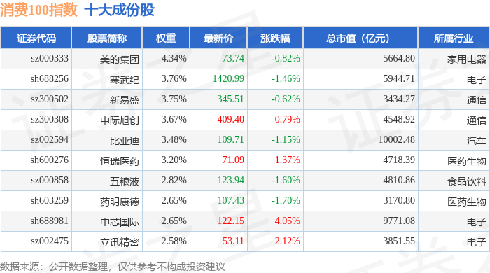 消费100(399364)指数十大成份股详情如下: