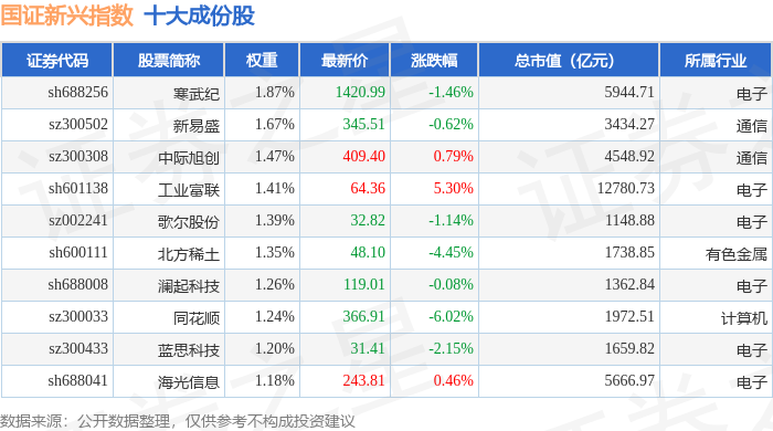 证券之星消息,9月18日,国证新兴(399392)指数报收于2978.14点,跌0.28%,成交5374.38亿元,换手率1.83%。当日该指数成份股中,上涨的有34家,中微公司以11.43%的涨幅领涨,下跌的有65家,同花顺以6.02%的跌幅领跌。