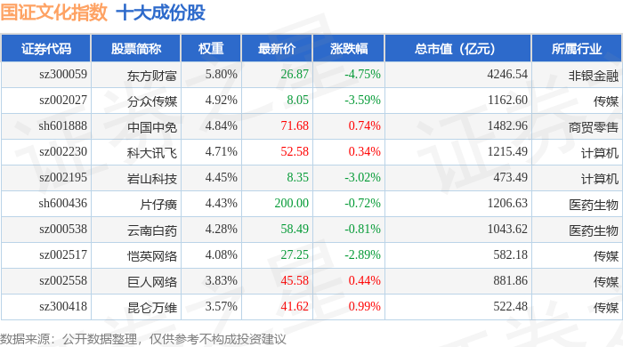 证券之星消息,9月18日,国证文化(399397)指数报收于2417.64点,跌1.36%,成交944.43亿元,换手率5.19%。当日该指数成份股中,上涨的有9家,利欧股份以2.22%的涨幅领涨,下跌的有41家,中国电影以8.53%的跌幅领跌。