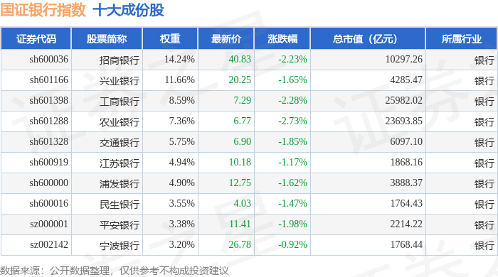 证券之星消息,9月18日,国证银行(399431)指数报收于7708.21点,跌1.89%,成交383.95亿元,换手率0.38%。当日该指数成份股中,下跌的有30家,常熟银行以3.17%的跌幅领跌。