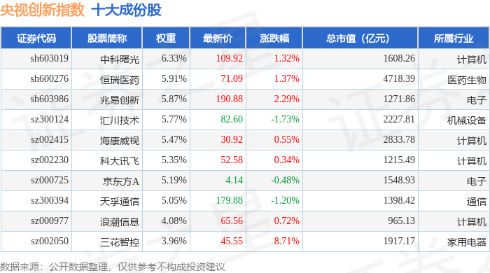 证券之星消息,9月18日,央视创新(399551)指数报收于10434.04点,涨1.3%,成交1585.77亿元,换手率4.12%。当日该指数成份股中,上涨的有25家,亨通光电以10.0%的涨幅领涨,下跌的有23家,欣旺达以4.43%的跌幅领跌。