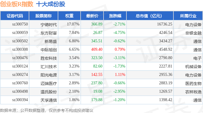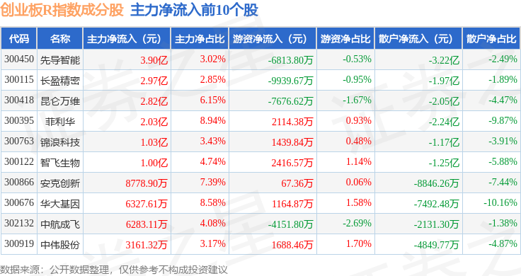 资金流向方面,创业板R(399606)指数成份股当日主力资金净流出合计189.11亿元,游资资金净流入合计65.39亿元,散户资金净流入合计123.72亿元。成份股资金流向详情见下表: