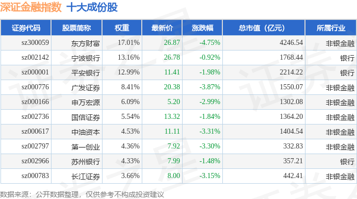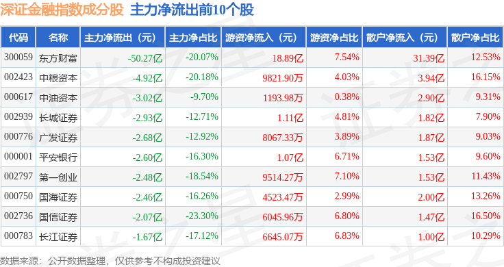 资金流向方面,深证金融(399619)指数成份股当日主力资金净流出合计80.91亿元,游资资金净流入合计27.47亿元,散户资金净流入合计53.44亿元。成份股资金流向详情见下表: