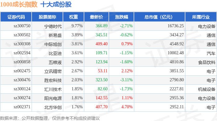 1000成长(399630)指数十大成份股详情如下: