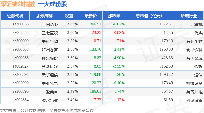 证券之星消息,9月18日,深证绩效(399655)指数报收于10741.22点,跌1.6%,成交1252.49亿元,换手率2.2%。当日该指数成份股中,上涨的有13家,三花智控以8.71%的涨幅领涨,下跌的有85家,同花顺以6.02%的跌幅领跌。