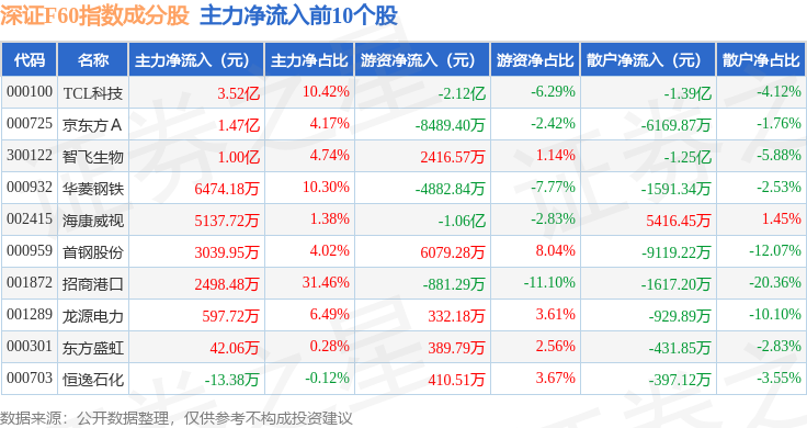 资金流向方面,深证F60(399701)指数成份股当日主力资金净流出合计125.43亿元,游资资金净流入合计35.8亿元,散户资金净流入合计89.63亿元。成份股资金流向详情见下表: