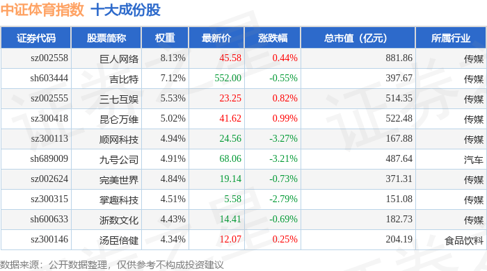证券之星消息,9月18日,中证体育(399804)指数报收于2133.88点,跌1.0%,成交268.14亿元,换手率5.16%。当日该指数成份股中,上涨的有9家,国恩股份以10.0%的涨幅领涨,下跌的有31家,星辉娱乐以6.88%的跌幅领跌。