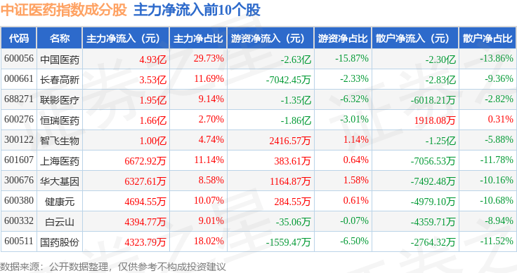 资金流向方面,中证医药(399933)指数成份股当日主力资金净流出合计5.76亿元,游资资金净流入合计2.98亿元,散户资金净流入合计2.78亿元。成份股资金流向详情见下表: