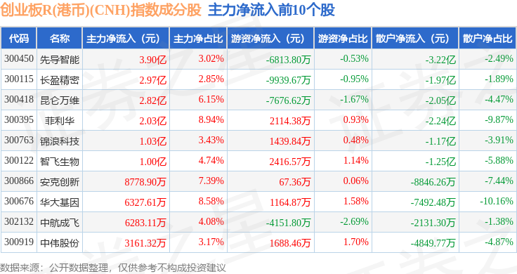 资金流向方面,创业板R(港币)(CNH)(470006)指数成份股当日主力资金净流出合计189.11亿元,游资资金净流入合计65.39亿元,散户资金净流入合计123.72亿元。成份股资金流向详情见下表: