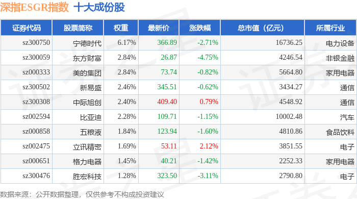 证券之星消息,9月18日,深指ESGR(470026)指数报收于18716.13点,跌1.01%,成交7686.44亿元,换手率2.85%。当日该指数成份股中,上涨的有90家,万向钱潮以10.03%的涨幅领涨,下跌的有308家,锡业股份以6.32%的跌幅领跌。