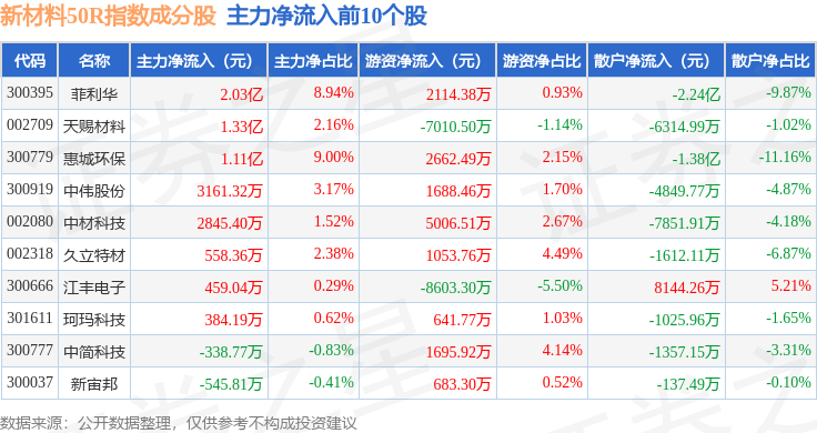 资金流向方面,新材料50R(470042)指数成份股当日主力资金净流出合计55.88亿元,游资资金净流入合计13.62亿元,散户资金净流入合计42.26亿元。成份股资金流向详情见下表: