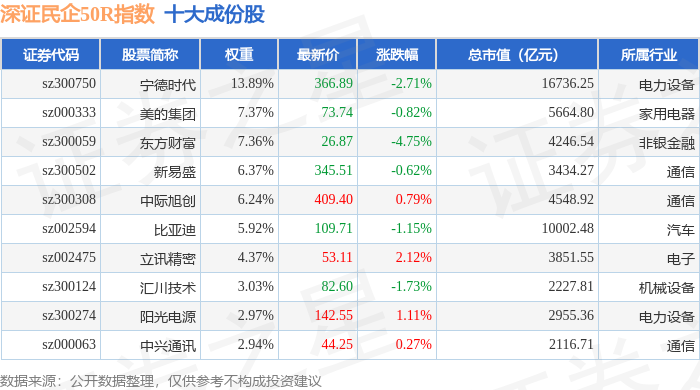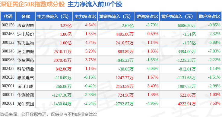 资金流向方面,深证民企50R(470057)指数成份股当日主力资金净流出合计155.2亿元,游资资金净流入合计40.74亿元,散户资金净流入合计114.47亿元。成份股资金流向详情见下表: