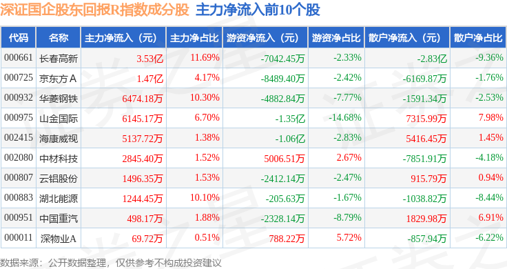 资金流向方面,深证国企股东回报R(470064)指数成份股当日主力资金净流出合计21.98亿元,游资资金净流入合计4.75亿元,散户资金净流入合计17.22亿元。成份股资金流向详情见下表: