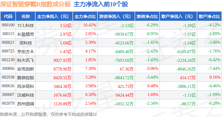 资金流向方面,深证智能穿戴R(470074)指数成份股当日主力资金净流出合计43.93亿元,游资资金净流入合计5.97亿元,散户资金净流入合计37.95亿元。成份股资金流向详情见下表: