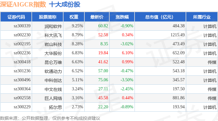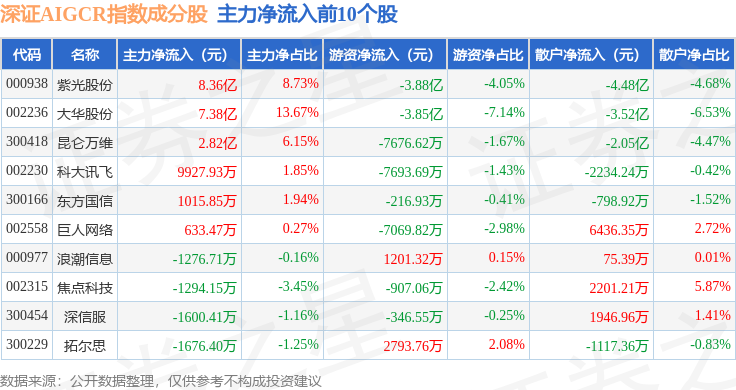 资金流向方面,深证AIGCR(470075)指数成份股当日主力资金净流出合计76.29亿元,游资资金净流入合计21.67亿元,散户资金净流入合计54.63亿元。成份股资金流向详情见下表: