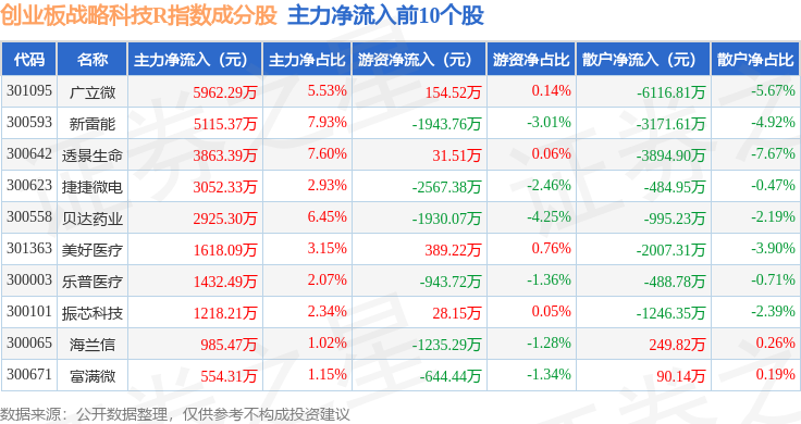 资金流向方面,创业板战略科技R(471004)指数成份股当日主力资金净流出合计19.31亿元,游资资金净流入合计4.11亿元,散户资金净流入合计15.2亿元。成份股资金流向详情见下表: