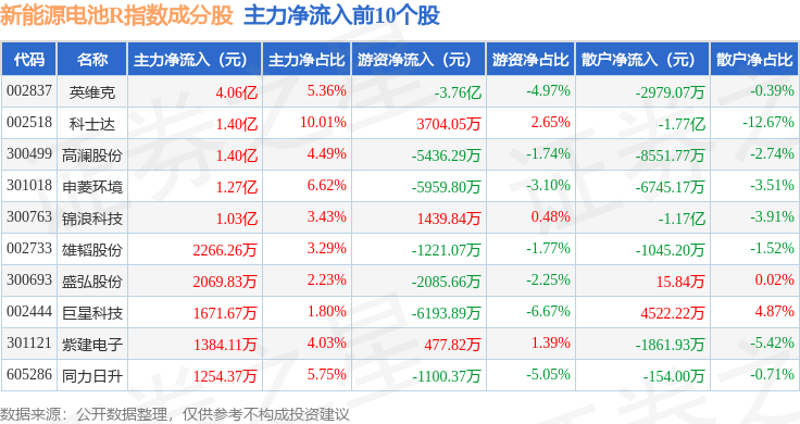 资金流向方面,新能源电池R(480027)指数成份股当日主力资金净流出合计36.13亿元,游资资金净流入合计4.95亿元,散户资金净流入合计31.18亿元。成份股资金流向详情见下表: