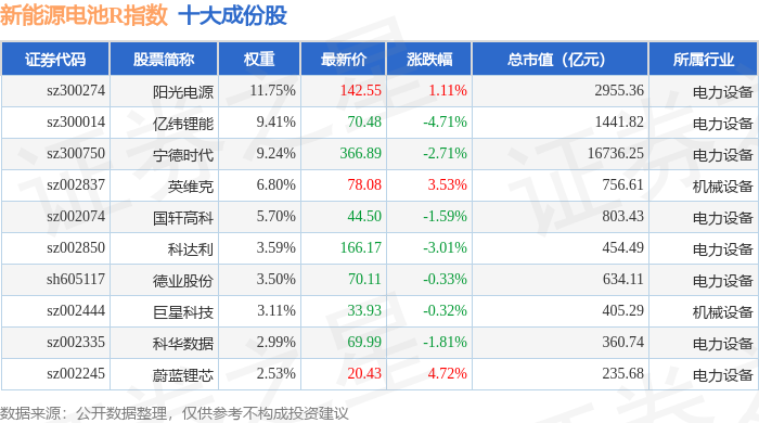 新能源电池R(480027)指数十大成份股详情如下: