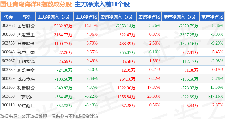 资金流向方面,国证青岛海洋R(480532)指数成份股当日主力资金净流出合计3.64亿元,游资资金净流出合计2659.76万元,散户资金净流入合计3.91亿元。成份股资金流向详情见下表:
