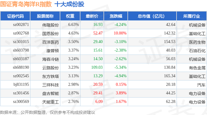 国证青岛海洋R(480532)指数十大成份股详情如下: