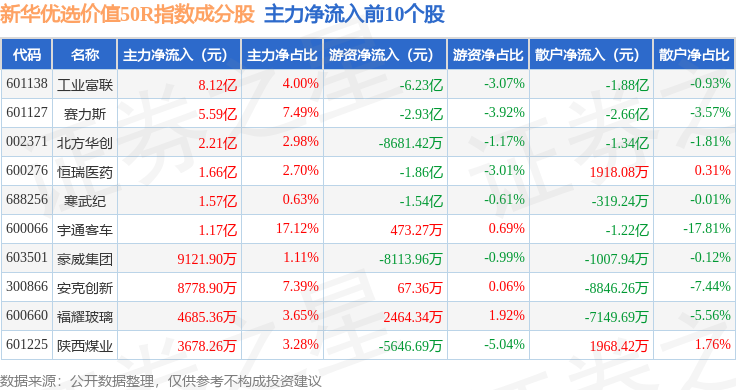 资金流向方面,新华优选价值50R(489004)指数成份股当日主力资金净流出合计158.58亿元,游资资金净流入合计46.4亿元,散户资金净流入合计112.18亿元。成份股资金流向详情见下表: