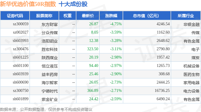 新华优选价值50R(489004)指数十大成份股详情如下: