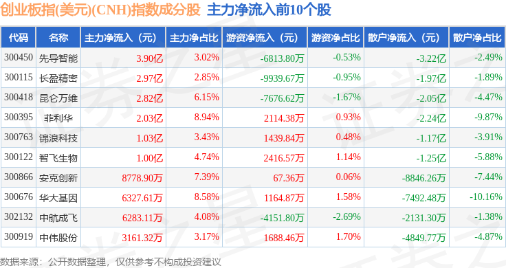 资金流向方面,创业板指(美元)(CNH)(970007)指数成份股当日主力资金净流出合计189.11亿元,游资资金净流入合计65.39亿元,散户资金净流入合计123.72亿元。成份股资金流向详情见下表:
