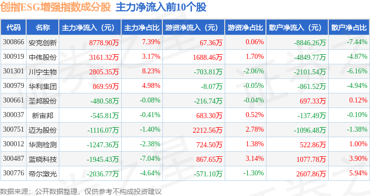资金流向方面,创指ESG增强(970034)指数成份股当日主力资金净流出合计147.83亿元,游资资金净流入合计53.72亿元,散户资金净流入合计94.12亿元。成份股资金流向详情见下表: