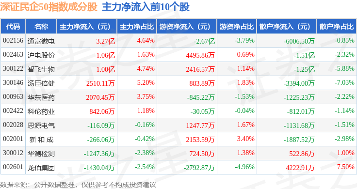 资金流向方面,深证民企50(970057)指数成份股当日主力资金净流出合计155.2亿元,游资资金净流入合计40.74亿元,散户资金净流入合计114.47亿元。成份股资金流向详情见下表: