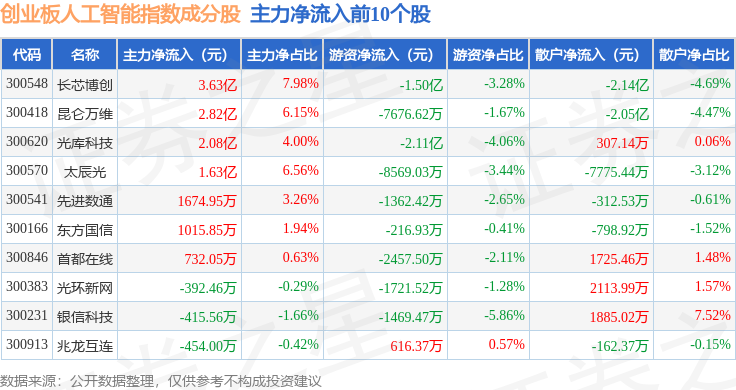 资金流向方面,创业板人工智能(970070)指数成份股当日主力资金净流出合计49.27亿元,游资资金净流入合计9.4亿元,散户资金净流入合计39.87亿元。成份股资金流向详情见下表: