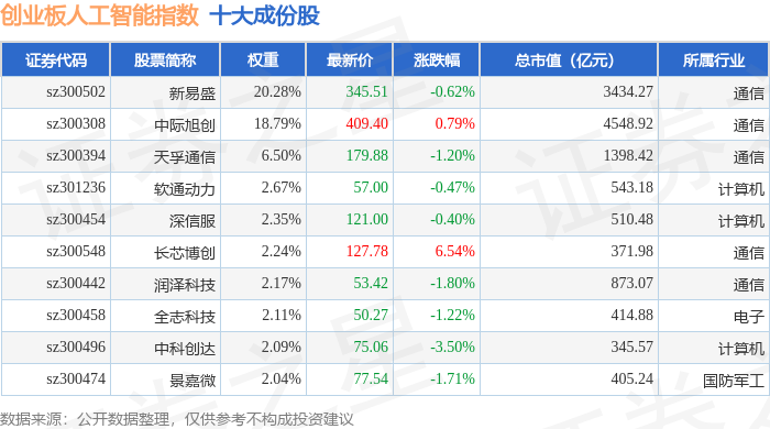 创业板人工智能(970070)指数十大成份股详情如下: