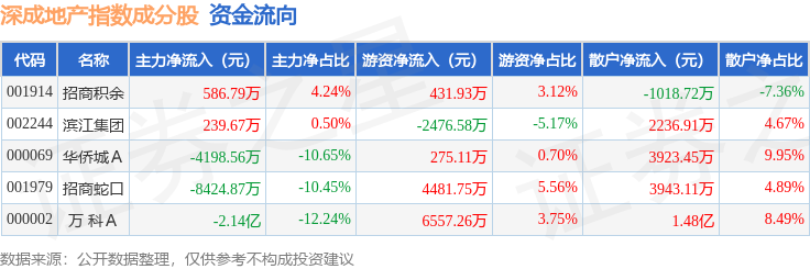 资金流向方面,深成地产(971001)指数成份股当日主力资金净流出合计3.32亿元,游资资金净流入合计9269.48万元,散户资金净流入合计2.39亿元。成份股资金流向详情见下表: