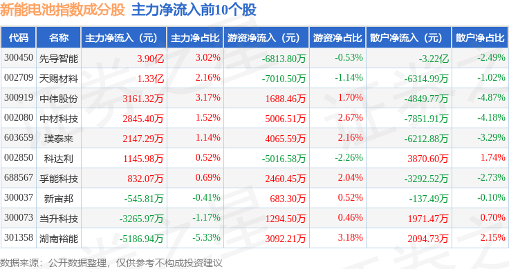 资金流向方面,新能电池(980032)指数成份股当日主力资金净流出合计53.65亿元,游资资金净流入合计11.85亿元,散户资金净流入合计41.8亿元。成份股资金流向详情见下表: