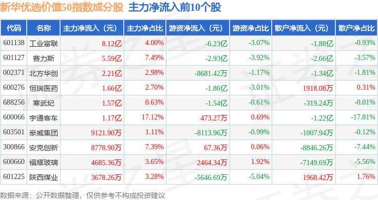 资金流向方面,新华优选价值50(989004)指数成份股当日主力资金净流出合计158.58亿元,游资资金净流入合计46.4亿元,散户资金净流入合计112.18亿元。成份股资金流向详情见下表: