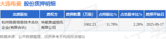 证券之星消息,大连电瓷(002606)9月18日公开信息显示,股东杭州锐奇信息技术合伙企业(有限合伙)向华能贵诚信托有限公司合计质押1002.23万股,占总股本2.28%。质押详情见下表: