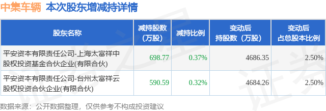 证券之星消息,9月18日中集车辆发布公告《中集车辆:关于持股5%以上股东减持计划实施完毕暨减持后持股比例低于5%的公告》,其股东平安资本有限责任公司-上海太富祥中股权投资基金合伙企业(有限合伙)、平安资本有限责任公司-台州太富祥云股权投资合伙企业(有限合伙)于2025年9月1日至2025年9月17日间合计减持1289.36万股,占公司目前总股本的0.688%,变动期间该股股价上涨1.98%,截止9月17日收盘报9.28元。