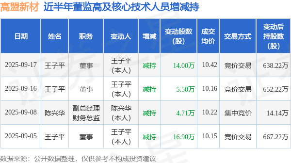 高盟新材近半年内的董监高及核心技术人员增减持详情如下: